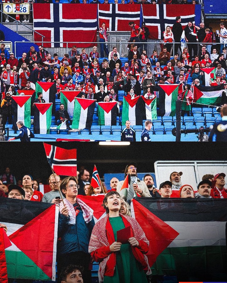رفعت جماهير مباراة النرويج وإسرائيل في ملعب أوليفال بالعاصمة النرويجية أوسلو الأعلام الفلسطينية تعبيرا عن التضامن مع الشعب الفلسطيني ورفض الممارسات الإسرائيلية.