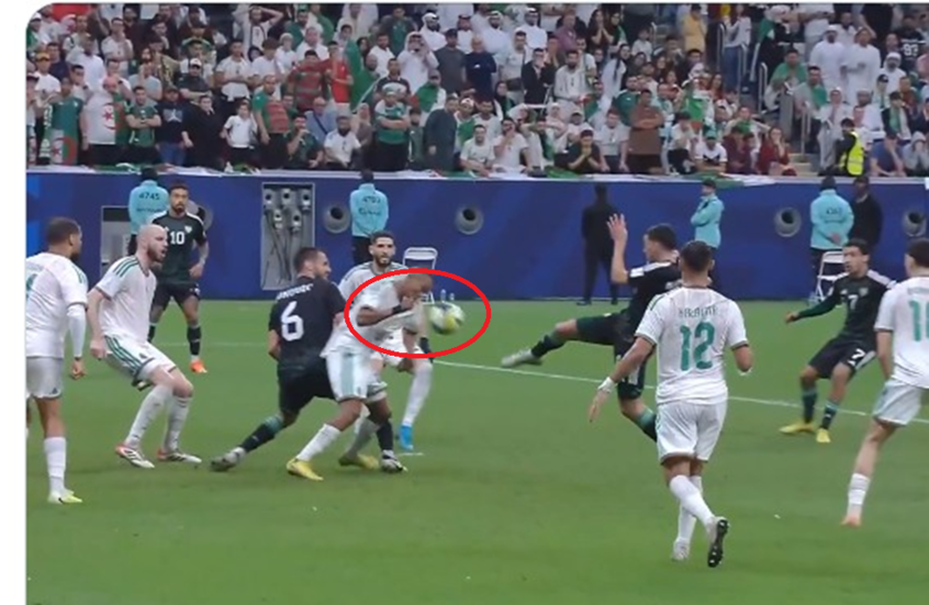 وأظهرت اللقطات المصورة، الكرة وهي تلمس يد المدافع الجزائري أشرف عبادة بوضوح أثناء محاولة الأخير إبعاد كرة عرضية داخل منطقة الجزاء، بيد أن الحكم لم يعد لتقنية حكم الفيديو المساعد “الفار” ليعلن نهاية الشوط الثاني بالتعادل 1-1.