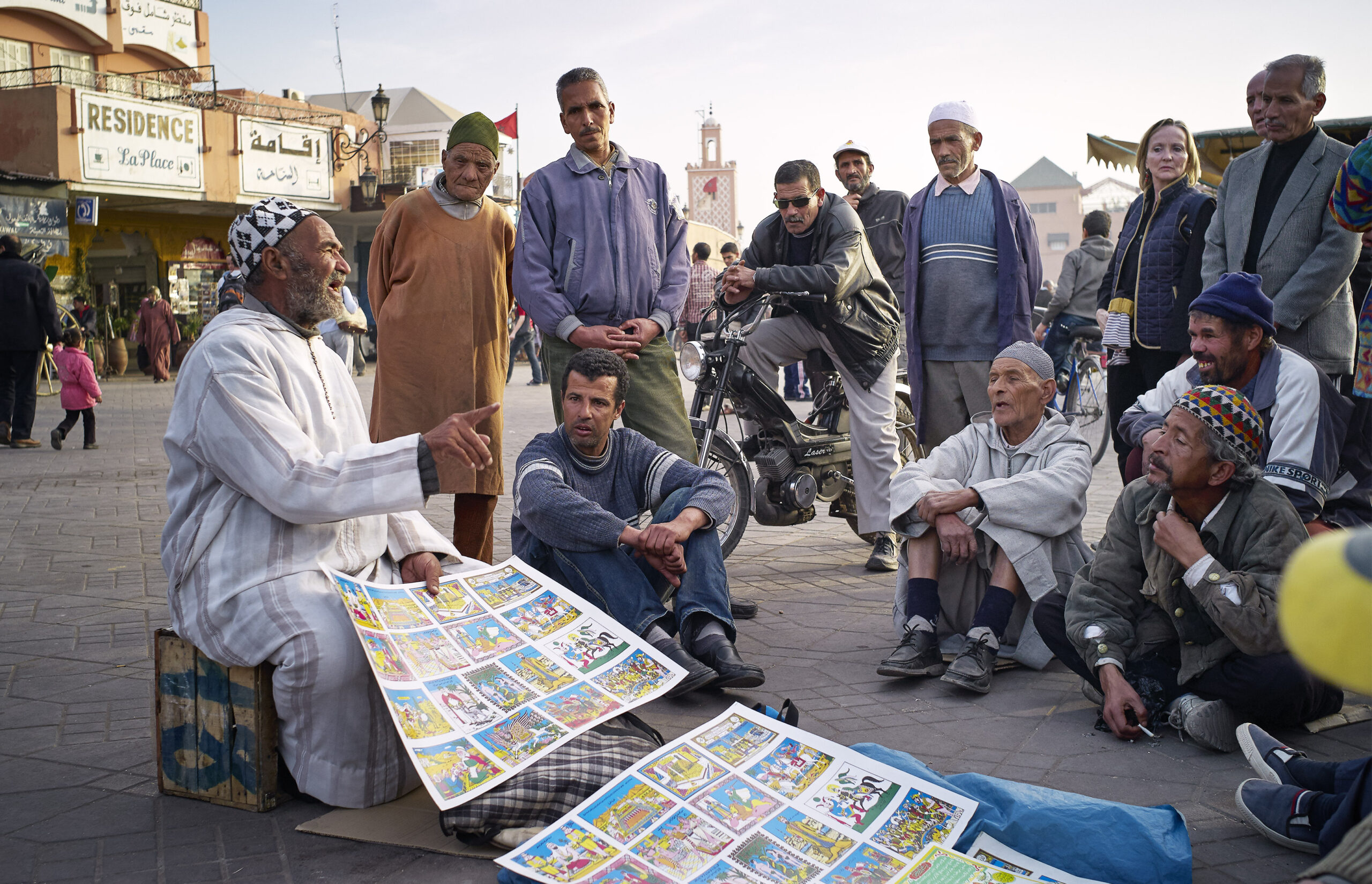 ومع تقدم الحكاية خلال الساعة اللاحقة جرت انعطافات غير متوقعة في خط القصة. وكان الجمهور متكونا من رجال فقط جلس بعضهم على الأرض يستمع بينما كان بعضهم يتكئ على دراجاته. وليس مفترضا أن تقف النساء هناك للاستماع إلى قصص «فاجرة» كتلك. وقال الجابري لاحقا «الشباب يحبون القصص من ألف ليلة وليلة لأنها اكثر انفتاحا. أما كبار السن فيحبون القصص حول حياة الرسول الصحابة. وهم يحبون قصص الحروب والمعارك بين المسلمين والفرس أو بين المسلمين والروم. كذلك يحب الناس المعجزات مثل إشفاء المسيح للأعمى». وقال بعض المتابعين للعادات المحلية إن القصص هي مزيج من حكايات شعبية ودينية من منطقة البربر والتقاليد العربية.