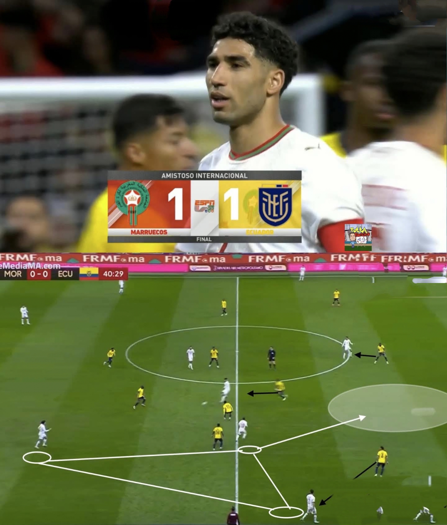 وكان المنتخب المغربي قد أنهى المقابلة الودية بتعادل أمام الإكوادور، على أرضية ملعب ميتروبوليتانو في العاصمة الإسبانية مدريد، حيث أن المنتخب الإكوادوري كان سباقا للتسجيل عن طريق اللاعب يوهان يوبواه في الدقيقة الـ48، فيما عدل الكفة للأسود الأطلس اللاعب نيل العيناوي برأسية محكمة، في حدود الدقيقة الـ88 المباراة عرفت كذلك تضييع العيناوي لضربة جزاء، أتمم تنفيذها محمد ربيع حريمات، لكن حكم اللقاء رفض الهدف،، لتنتهي المواجهة الأولى للنخبة الوطنية على وقع التعادل