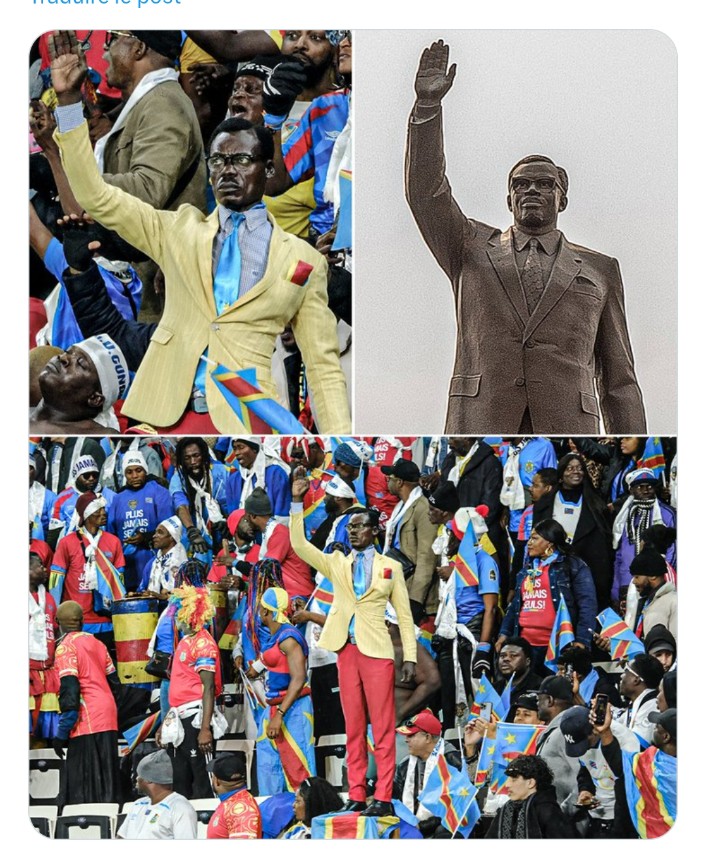 ويرفع المشجع الملقب بـ”لومومبا فيا”، والمعروف بشبهه بالزعيم الراحل، ذراعه اليمنى ويبقى ثابتا تماما طوال المباريات، ليظهر بوضعية تمثال لومومبا التذكاري في كينشاسا.