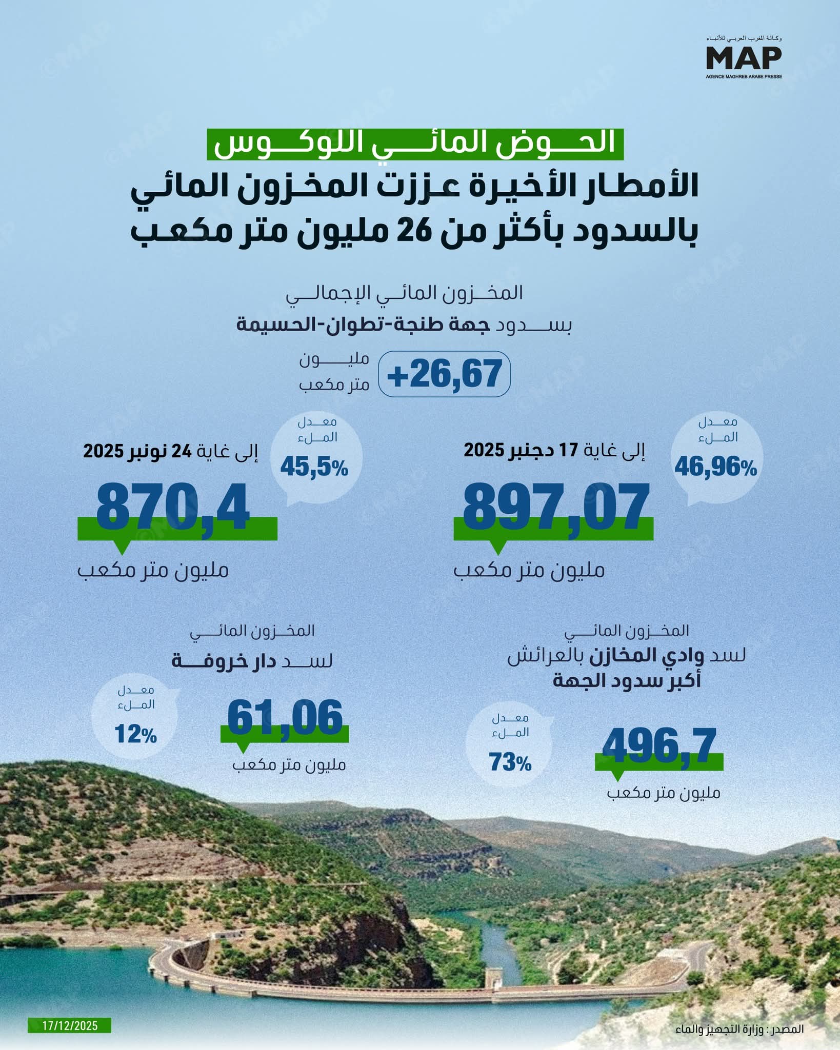 أنعشت الأمطار الأخيرة، التي تهاطلت على مستوى جهة طنجة-تطوان-الحسيمة، المخزون المائي للسدود الكبرى الواقعة ضمن منطقة نفوذ وكالة الحوض المائي اللوكوس بأكثر من 26 مليون مكعب من المياه:
