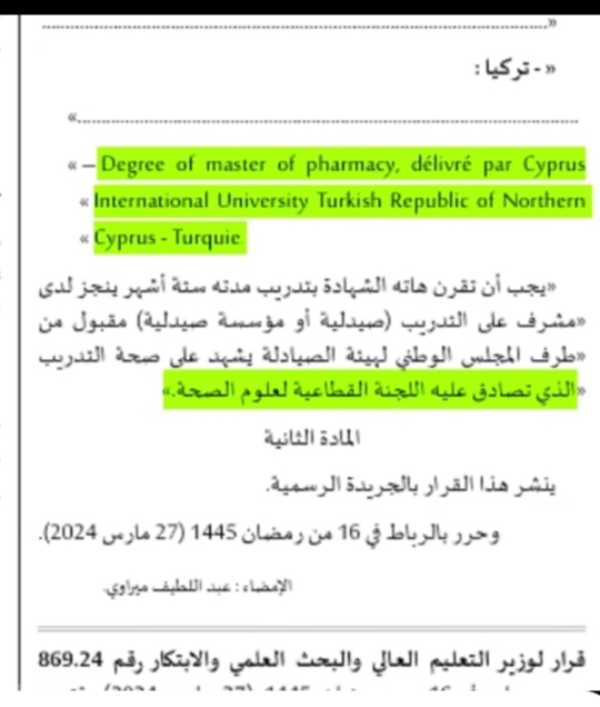يذكر أن قرار الاعتراف بشهادات جامعات قبرص في مجال الصيدلة قد نشرت بالجريدة الرسمية بتاريخ 16 من رمضان 1445 الموافق ل(27) مارس 2024 على أن تقرن “الشهادة بتدريب مدته ستة أشهر ينجز لدى مشرف على التدريب صيدلية أو مؤسسة صيدلية مقبول من طرف المجلس الوطني لهيئة الصيادلة يشهد على صحة التدريب الذي تصادق عليه اللجنة القطاعية لعلوم الصحة”.